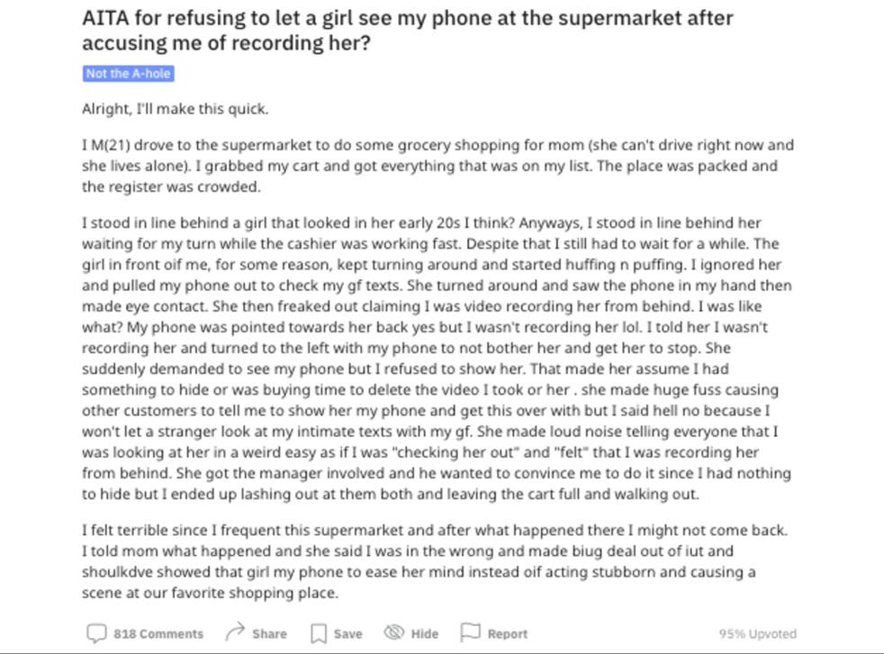 Man Divides Reddit After Defending Refusal To Show Woman His Phone When She Accused Him Of Filming Her Indy100